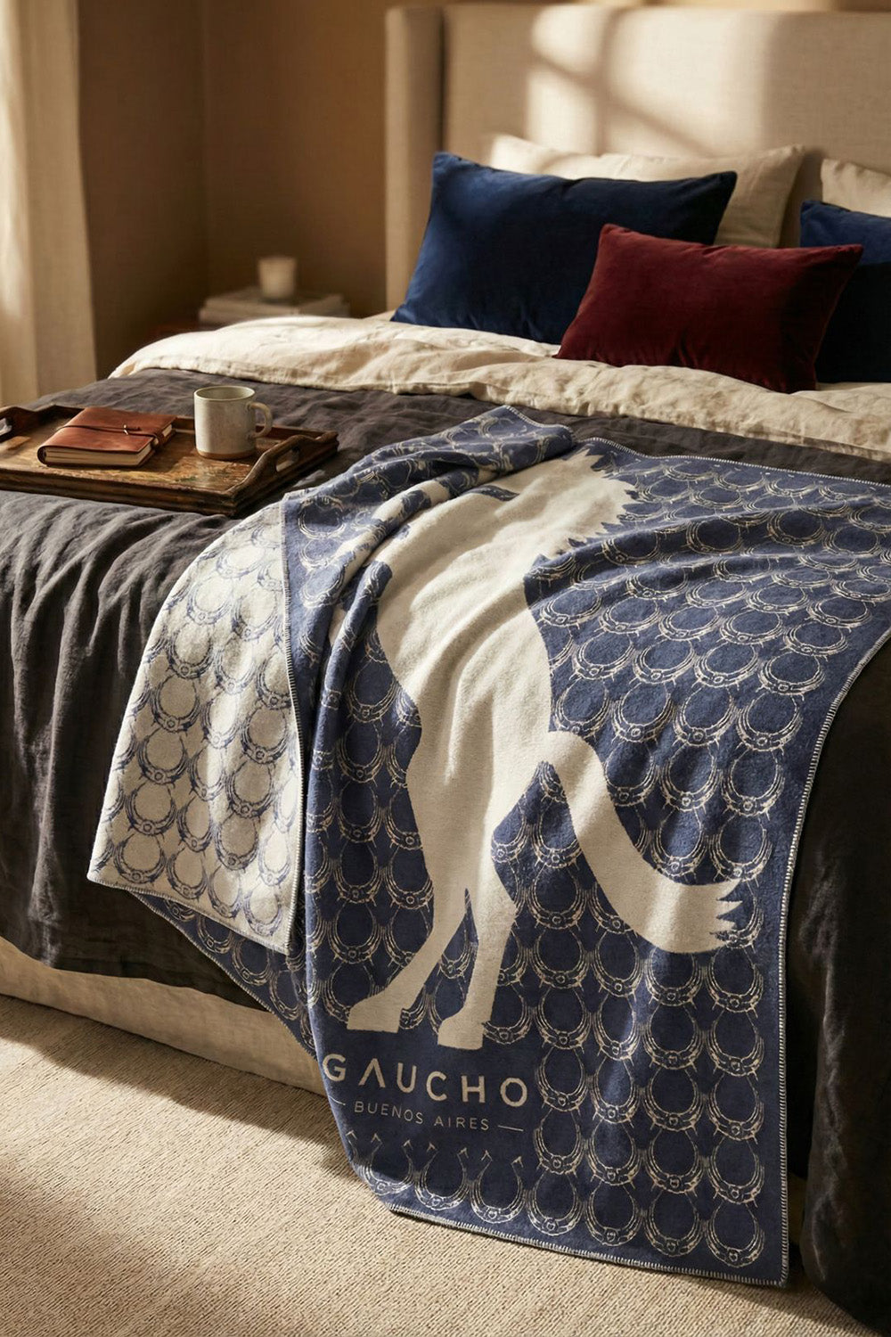 The Iconic Stallion throw blanket is crafted in Italy from pure wool, featuring the Gaucho – Buenos Aires logo woven into a refined jacquard design framed by a rearing-horse silhouette. Soft, substantial, and beautifully finished, it brings warmth and character to sofas, beds, or lounge chairs—equally at home in city apartments or country retreats. A timeless accent piece designed for layering, comfort, and everyday living.